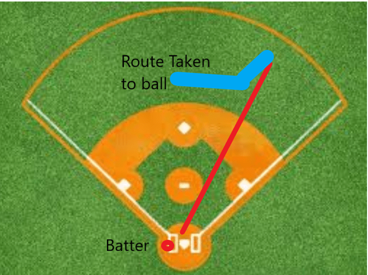 Here is my hand-made diagram of the play. The red line is the path of the baseball. The blue line is how I ran towards the ball. I ran to right field and then made a mental sigh of relief when I thought the ball was not within reach so I pivoted to catch the ball. FYI – THIS IS NOT THE ROUTE YOU TAKE TO CATCH A BALL LIKE THIS! I ran right after the pitch was thrown. I reacted once the ball was in the air.